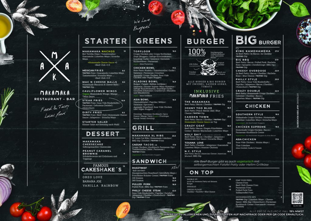 Das „makamaka“ bietet jedoch nicht nur Burger an, sondern auch eine Vielzahl von vegetarischen Optionen. Probieren Sie den „Chicken Supreme Burger“ mit veganen NoNugget, Parmesan Knoblauch Creme, roten Zwiebeln und frischen Salatblättern.